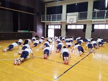 1年生の体育では『集団行動・ラジオ体操』を行っています。