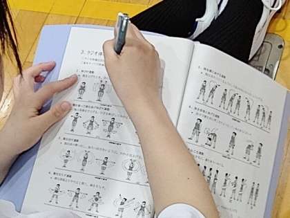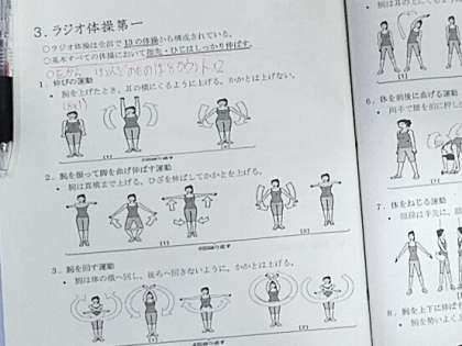 ファイルを見ながら、ラジオ体操の動きをしっかり確認していますね〜。