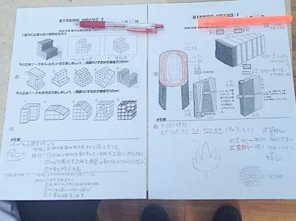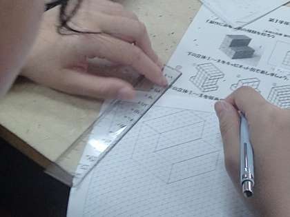 1年生の技術では『等角図を描こう』で製図を学んでいます。