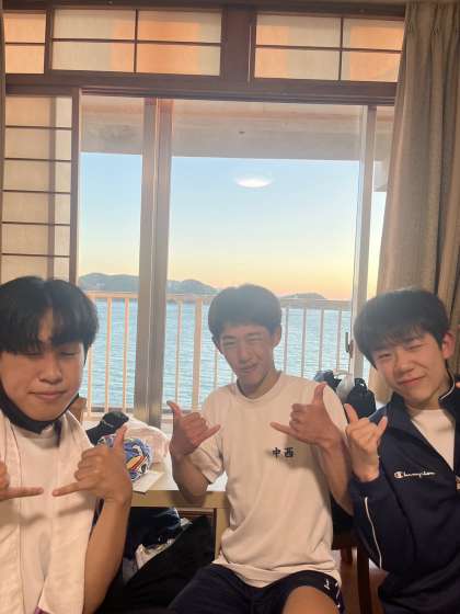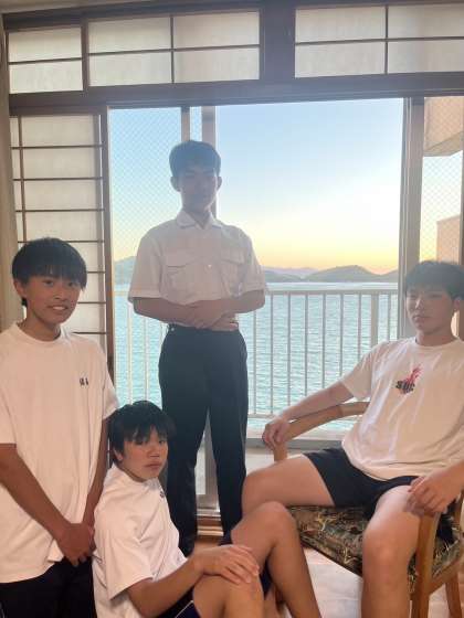1組男子、オーシャンビューの部屋でメンバーと楽しんでいます。