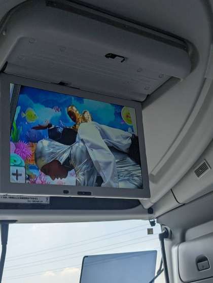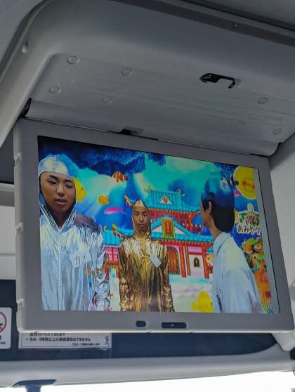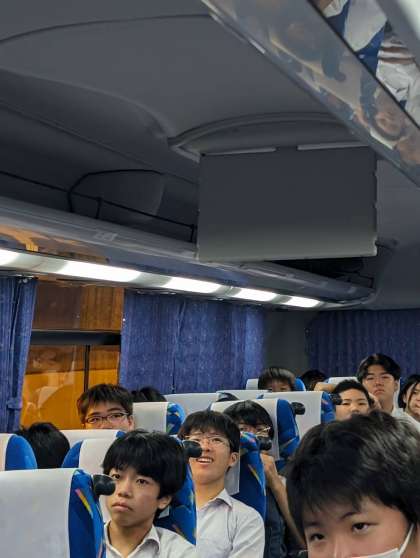 車内では、桜宮中学校版の浦島太郎のDVDが放送されています!お菓子を食べながら鑑賞を楽しんでいる2組バス車内です。