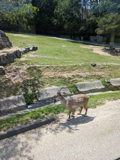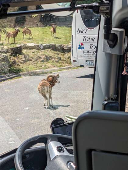 道の真ん中に動物が!ここでは動物が優先です。動いてくれるのを待ちます。