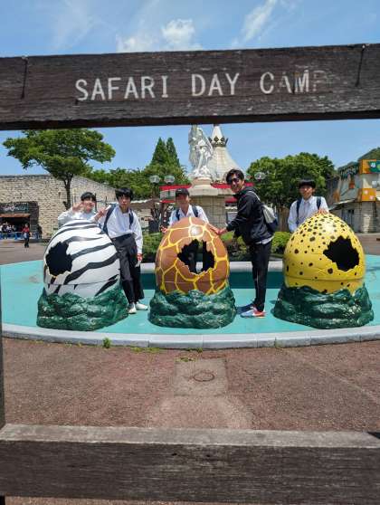 今からアトラクションゾーンで遊びます!N先生は乗り物に早く乗りたいと、生徒の誰よりも早く行こうとしています。