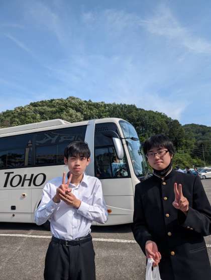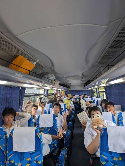バスに乗って今から帰ります!姫路セントラルパークでも、おみやげたくさん買いました!2組の車内ではイチオシおみやげとともに記念写真です!