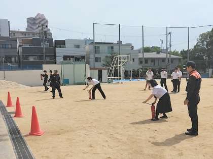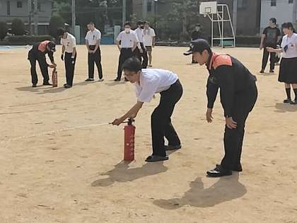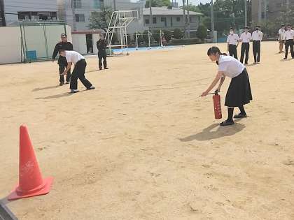 消防士さんから消火器の使い方を教えていただき、委員長が代表で実際に消火の練習しました。