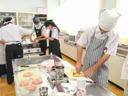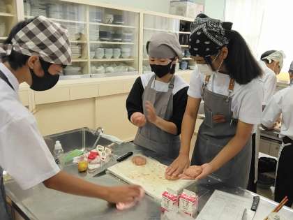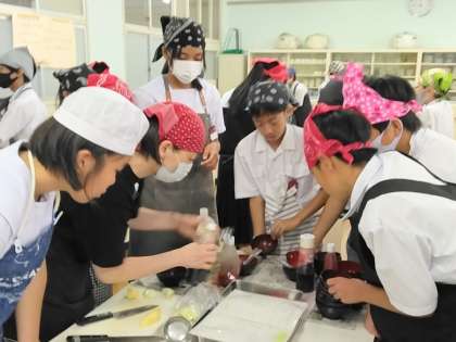 仲原先生が各班の代表を集めて、トマトソースの作り方を説明しています。