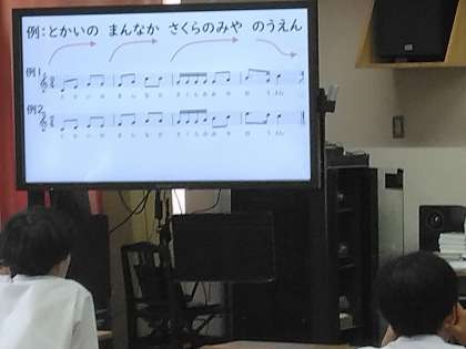 しかし本校では音楽科の研究授業が行われるので、2年2組の子どもたちは他校の先生方が見ている中で、音楽の授業をしています。