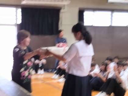 同窓会長の松下喜代子様から1年生の代表に贈呈されました。