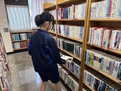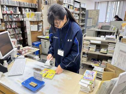 図書館では、図書の貸し出しや返却の対応、担架の本を棚に戻す作業をしています。