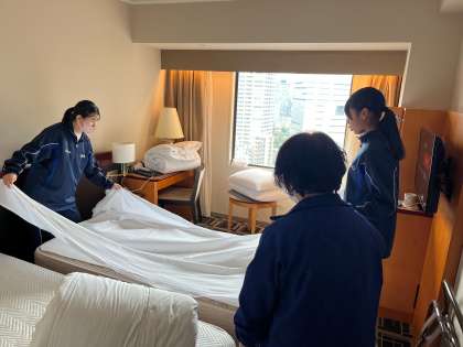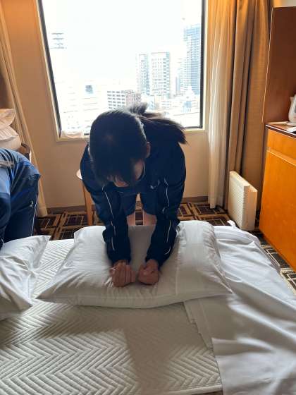 ホテル阪神大阪では、ベットメイキングの仕事をしています。午後からはフロントの仕事をします。
