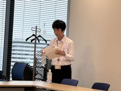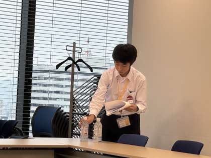 2日間の研修をで学んだことを、他の社員さんに向けてプレゼンテーションをしています。名刺交換などのビジネスマナーも教わりました
