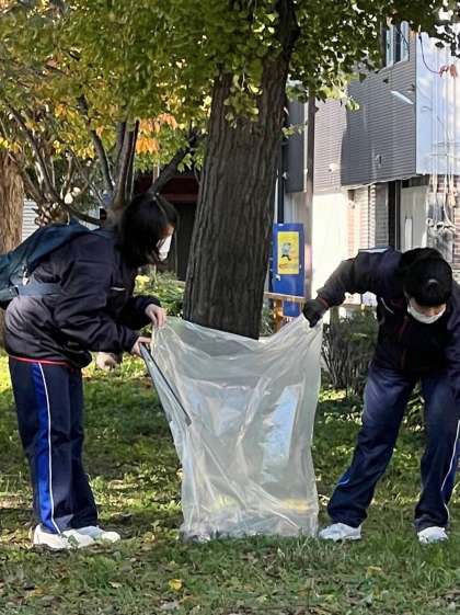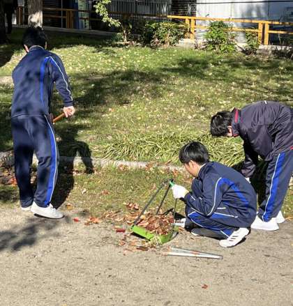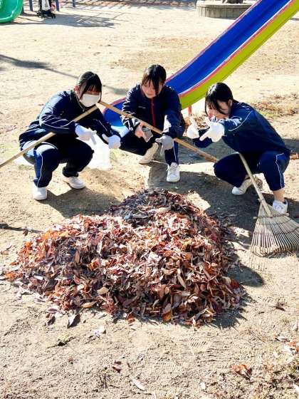 3年生の女子3人組が、落ち葉でハートマークを作っています。