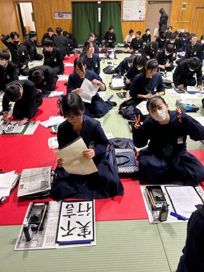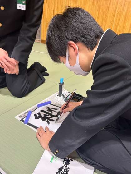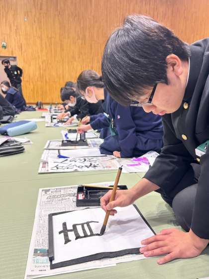 生徒たちは、それぞれ受験への決意や新年の目標、志を表す漢字一字または二字を書き上げました。