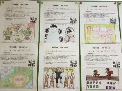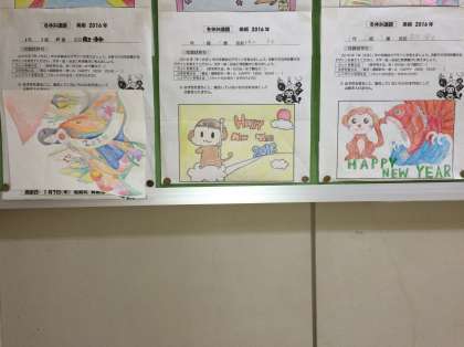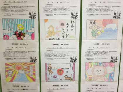 美術科で冬休みに出されていた「年賀状デザイン」の優秀作品が展示されています。