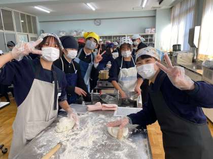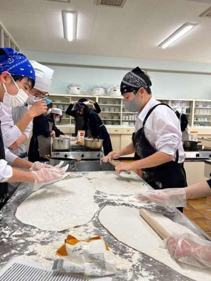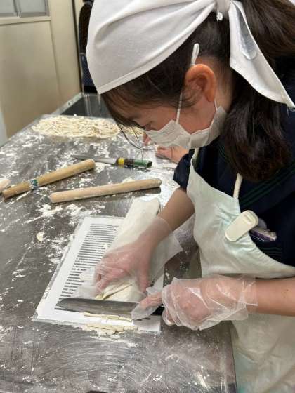 班で協力して、粉を計る、混ぜる、踏む、伸ばす、切る、茹でるの工程を経て、美味しいうどんができあがりました。