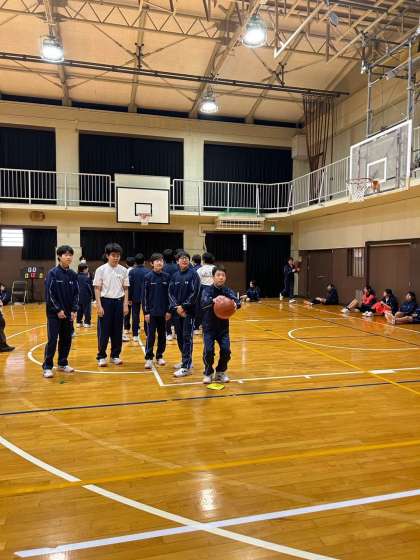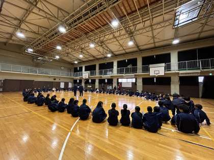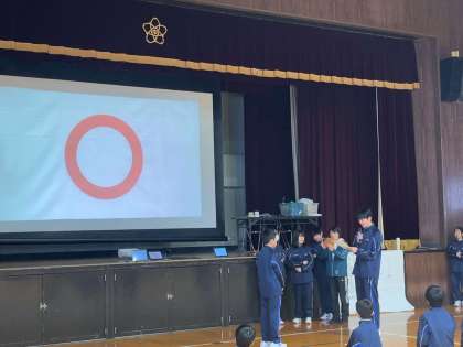 1年生は19日に、スポーツ大会を行いました。まずは○×クイズで楽しみ、その後はじゃんけん列車で学年が一つの輪になりました。