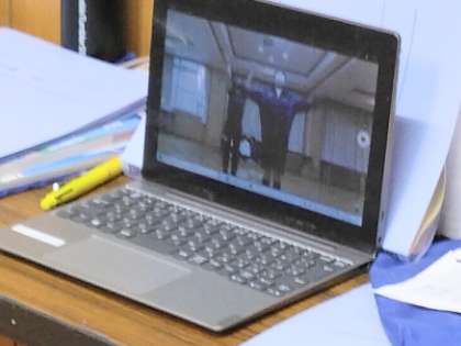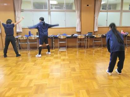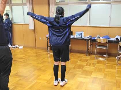 この時間、男子は武道場で行っていますが、女子は多目的室で体育を行っています。