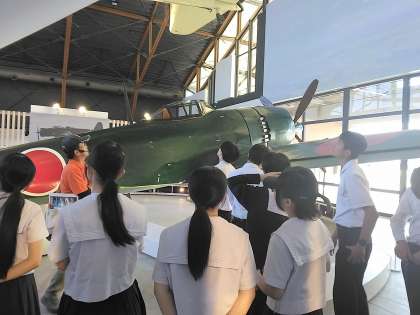 実物大の模型を見ながら説明を聞き、当時の様子や特攻隊員の心境を学びました。