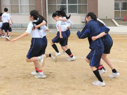 気持ちを合わせて、ムカデ競争や2人3脚走の練習です。