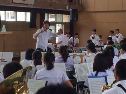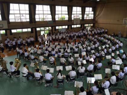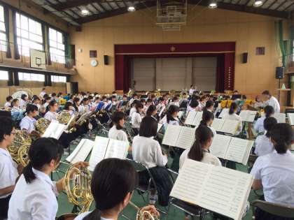 6/4(土)たそがれコンサートの合同練習が大阪市立高津中学校で行われました。この行事は毎年7月から8月にかけて毎週金曜日の夕方に、大阪城野外音楽堂で行われるコンサートで、大阪市内の中学校も数校合同演習で出演しています。本校は7/1(金)に文の里、高津、春日出、桜宮、阿倍野、木津の6校で出演する予定で、今回はその第1回目の合同練習会でした。次回は6/18(土)に2回目の練習会が文の里中学校で行われます。