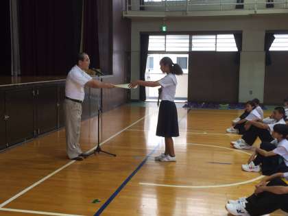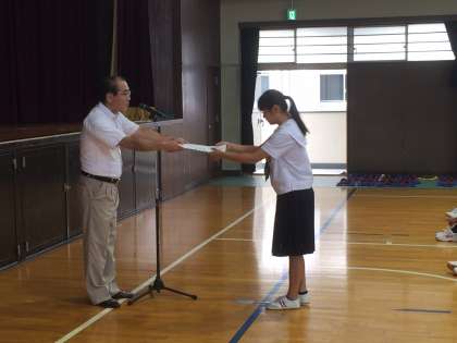 9/5(月)全校集会が行われ、水泳部の生悦住さん、テニス部の表彰が行われました。