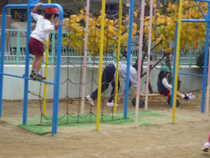 みどり、あお、あか、き、ももの各クラスの生活に中学生も5〜6人ずつ分かれ、参加しました。隣接する桜宮公園で走り回ったり、落ち葉集めしたり、園庭での様々な遊びをしました。