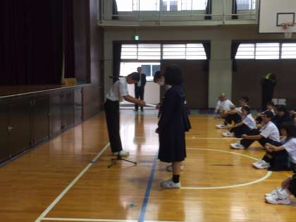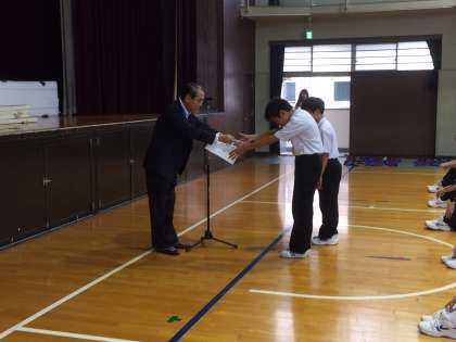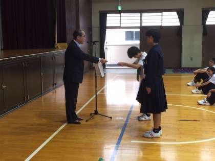 その後、体育大会で作成した学級旗の投票が行われ、最優秀賞に選ばれた2年3組、優秀賞に選ばれた2年2組と1年3組がそれぞれ表彰されました。