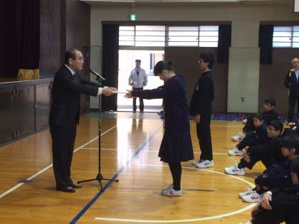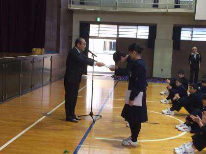 12/5(月)全校集会が行われました。部活動の表彰で演劇部が第136回大阪府中学生演劇祭にて佳良賞を受賞し、吹奏楽部が第14回大阪市立中学校アンサンブル・フェスティバルにおいて木管8重奏が金賞、金管8重奏が銀賞を受賞し表彰されました。おめでとうございます。