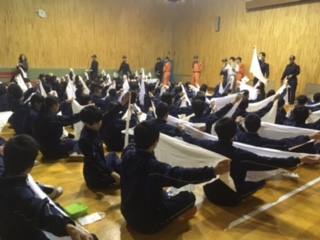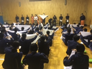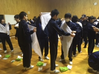 三角巾を使って応急処置を学習しました。今後いざという時に役立ちますね。