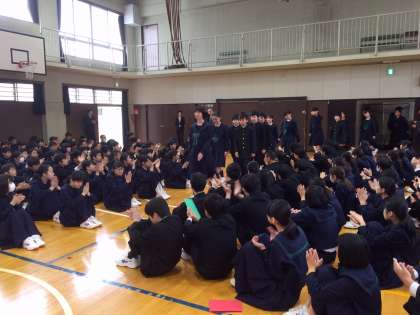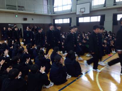 新しいスタートにふさわしい、爽やかな晴れの天気となりました。新2、3年生は新しいクラスの発表があり、その後体育館で新1年生の対面式が行われました。先輩が見守る中、少し緊張した様子で登場した新1年生でしたが、もう立派に桜宮中学校の一員となって式に臨んでいました。在校生のお祝いのことば、クラブ代表のあいさつの後、新入生の代表のあいさつがありました。対面式のあとは1学期の始業式が行われ、ソフトテニス部、卓球部の表彰が行われ、校長先生のお話がありました。