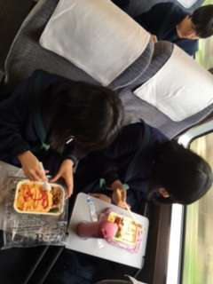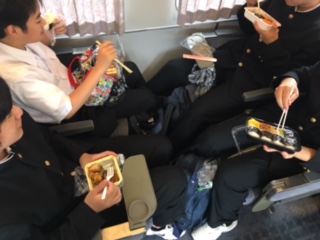 車窓からの水田の美しい光景です。車内はお弁当のいい匂いでいっぱいです。