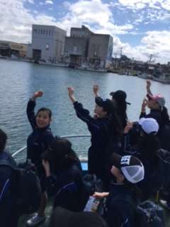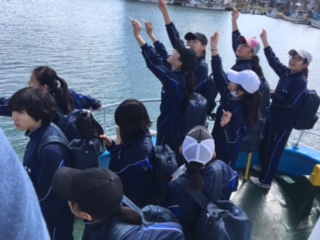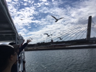 沖には出られませんが、カモメの餌付けに大興奮です。カモメにトンビにたくさん飛んできます。