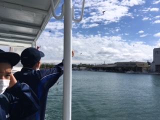 指に持ったかっぱえびせんを貰いに、一生懸命飛んできます。みんな大興奮のクルージングです。