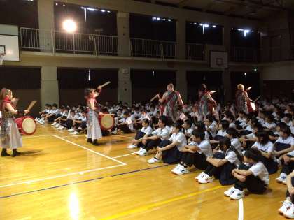 さまざまな種類の和太鼓による圧倒的な迫力のあるサウンドが、地響きのように体育館を揺らし、演奏者のキレのある動きとコミカルな演技で、楽しませていただきました。『打打打団天鼓』のみなさんは国外でも演奏する有名な和太鼓集団ですが、生徒や教師にも和太鼓体験をさせていただくなど、私たちにも楽しめるようなわかりやすさとパフォーマンスで、とても身近に感じるライブを楽しむことができました。