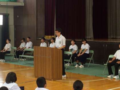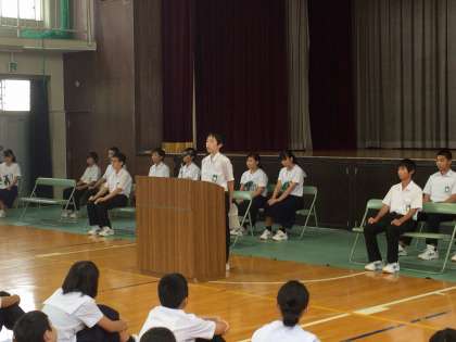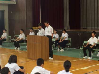 9/15(金)6時間目、後期生徒会立会演説会が行われました。今回は生徒会規約第4条により立候補者は無投票当選となりました。選ばれたみなさんはそれぞれ所信表明され、これからの桜宮中学校の生徒会の伝統を受け継いでいただきたいと思います。