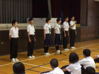 10/2(月)全校集会が行われました。まず前期生徒会のみなさんが、今までの生徒会活動を振り返り、あいさつされました。前期役員のみなさんお疲れさまでした。そして後期生徒会の認証式があり、新しい桜宮中学校を担う生徒会からあいさつがありました。これから後期生徒会のみなさんは頑張って欲しいと思います。