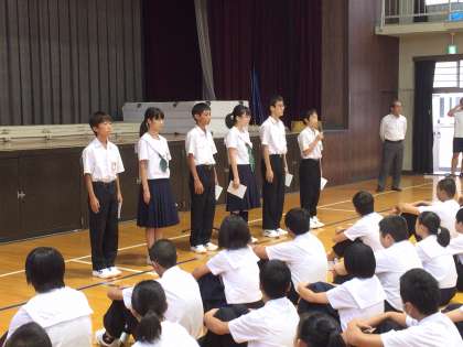 その後、後期学級役員の認証式も行われました。続けて、水泳部の表彰が行われたくさんのみなさんが表彰されていました。中には大会新記録を打ち出した人もおられました。おめでとうございます。