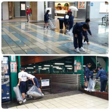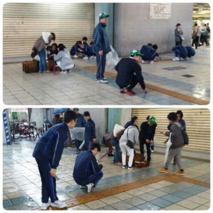 雨のかからないガード下のゴミ拾い、へばり付いたガムの除去など、地域の青少年指導員の皆さんやPTA役員・実行委員会の皆さんと協力しながら30分ほど清掃活動しました。