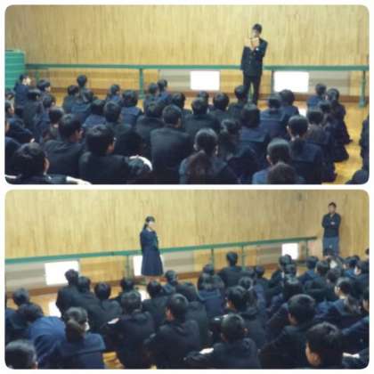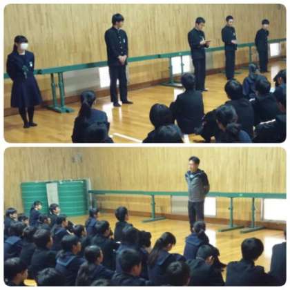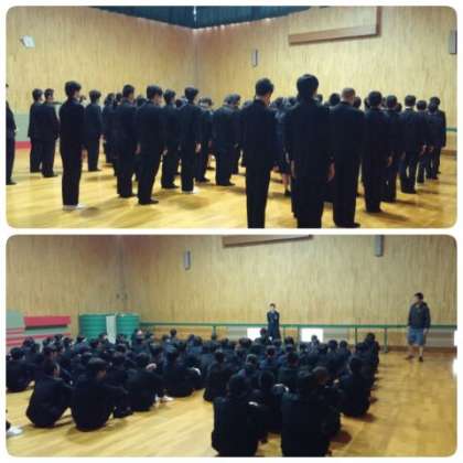 8時15分に教室から武道場に移動し、8時20分には委員長の指示のもと学年集会が始まりました。