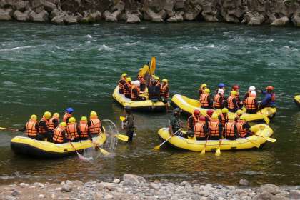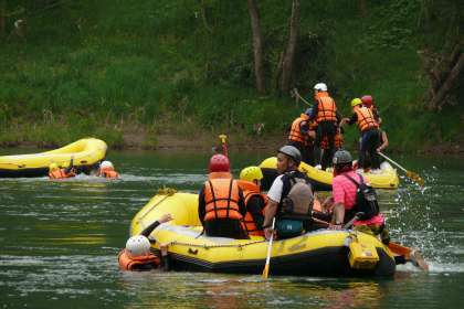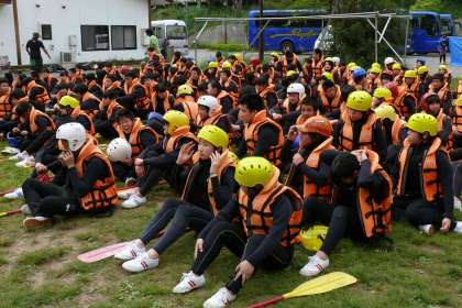 クラスごとのバスの中にラフティングのインストラクターさんが乗り込んできて、説明が始まりました。まずは着替えて、その後グループごとにインストラクターさんを紹介されました。そしてボートに乗り込み、川岸近くで少し練習をして出発。頭にヘルメット、手にオール、上半身にはライフジャケット。完全装備で臨みます。最初は恐る恐る、そのうち慣れてきて大胆に、インストラクターさんの指導で川に飛び込むことも楽しみました。