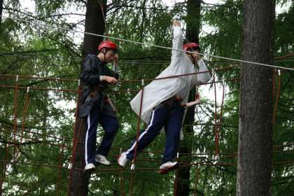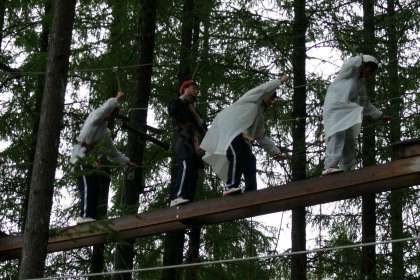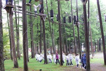 ぐっすり眠っていた皆さんは夜中の雨音の大きさを知らなかったでしょう。が、目が覚めたときも、朝食の間も雨はずっと降っています。ホテルの皆さんにお別れを告げ、バスに乗り込んだ皆さんは、午前中の取り組みがどうなるのか心配で・・・。雨のなかでもEXアドベンチャーを実施すると聞いて喜びの声があがったバスもありました。ホテルのすぐ近くに体験場所はあり、クラスごと男女別に、それぞれインストラクターさんが付きます。心なしか雨も小降りとなり、地上で体を動かして、出された指示を自分たちで相談してやりこなすグループの輪が広がりました。一方空中8メートルの冒険コースに挑戦するグループは、ヘルメットとハーネスをつけて、一つ一つのエレメントを進んでいきます。インストラクターさんが一緒にいるとはいえ、一歩を踏み出すのは自分です。その一歩をどうすればいいのか、何度もためらって進めずにいる姿がありました。前後のメンバーで声をかけ、励まし合います。ためらいを振り切って一歩ずつ前へ進んでいきます。最後のほうのエレメントに進むにつれて、恐怖心を乗り越えていったのでしょうか、スムーズに進んでいったように見えましたが…。小降りになったはずの雨がいつの間にか本降りに戻りましたが、雨にめげることなく取り組みをした成果は大きかったと思います。