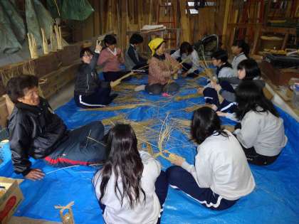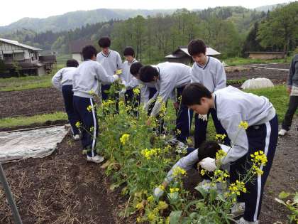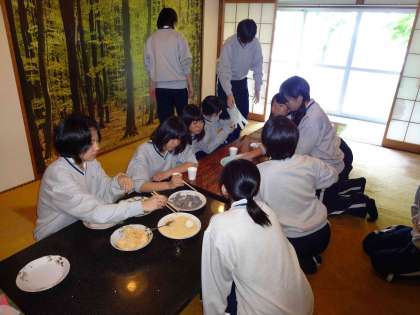 EXアドベンチャーの体験場所からすぐ近くのところで、カレーライスを頂いた後、バスで「さのさか地区」へ移動します。二日目の午後からお世話になる「さのさか地区」の農家の皆さんと体育館で対面し、それぞれの農家のお宅へ活動班ごとに移動しました。雨に濡れた体をお風呂で温めた後、農家での取り組みが始まります。雨は降り続けていましたので、大半が家の中での活動でしたが、中にはハウスの中の農作業もありました。