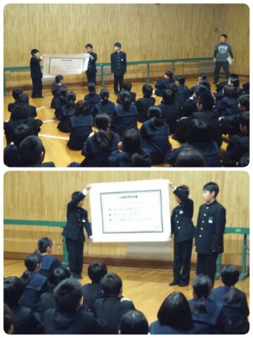 はじめに、昨日行われた委員長会議で決定した『一泊移住学年目標』が男子の学級委員長から発表されました。
