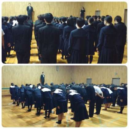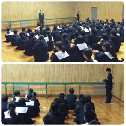 西川先生から、6月6日・7日に行われる「職場体験学習」に向け、服装や身だしなみ、大きな声でのあいさつや礼の仕方などについて話があり、繰り返し練習に取り組みました。