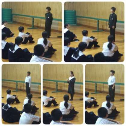 はじめに、先週行われた各専門委員会の報告がありました。保健委員会・文化委員会・美化委員会・図書委員会・風紀委員会の各代表から、各委員会で話し合った先月の課題、目標、目標達成に向けた取組やお願いなどについて報告されました。