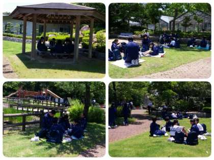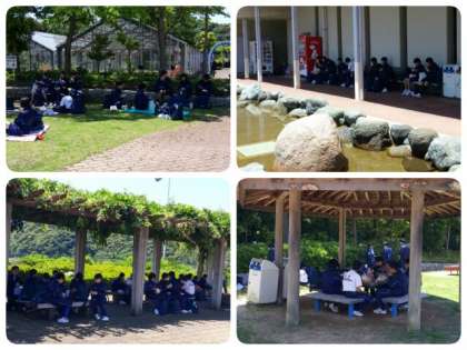 各班思い思いの場所を見つけ、楽しそうに弁当を食べ始めました。