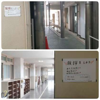 生徒会では、廊下や玄関にポスターを掲示しました。登下校時、授業の始めと終わり、廊下ですれ違ったときに「相手の目を見て、明るく、大きな声であいさつしよう」と呼びかけています。