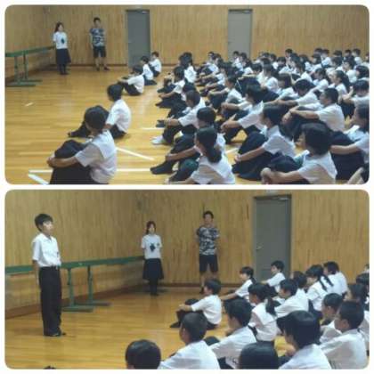 先週の学年集会から学級委員長が進行を務めるようになり、今日は2組委員長の藤下さんが司会を務めました。