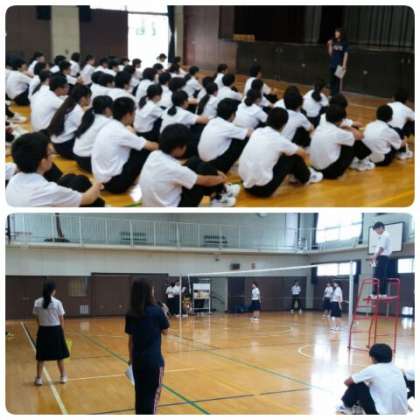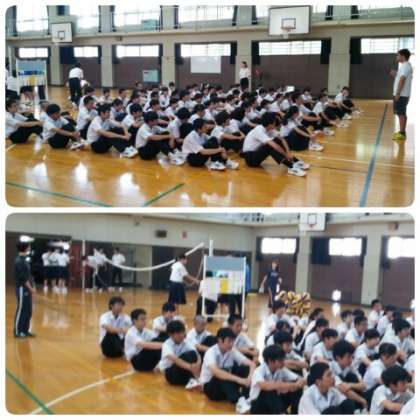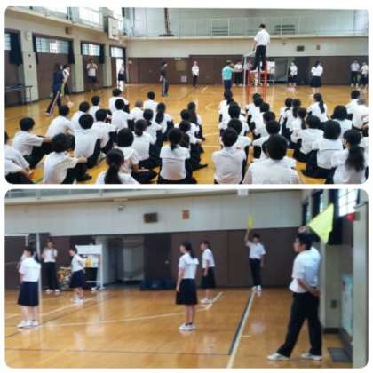体育係が見本となり、留山先生の指導のもと、バレーボールのルール、主審・副審・線審の役割や動作などについて、説明を聴きました。