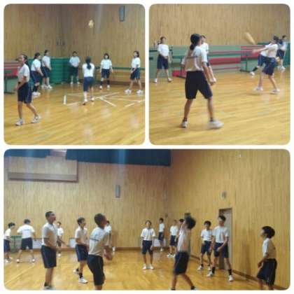ローテーションを組み、2クラスが体育館で試合形式の練習、1クラスが武道場でパス練習にチームごとに取り組んでいました。